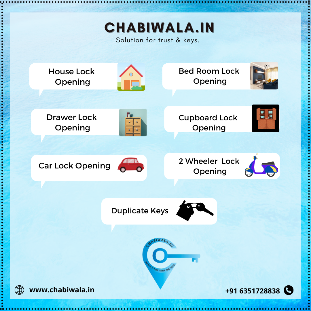 We can open the lock without damaging it. We are providing Main/Bathroom Door lock opening service, Shop lock opening service, 2-wheeler lock opening service, Car lock Opening service, Cupboard Lock Opening, etc.